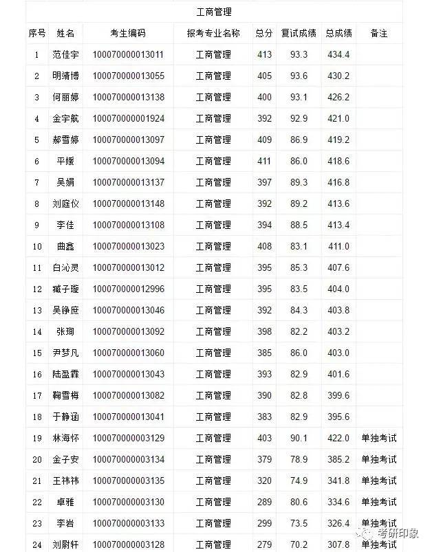 工商管理学硕统考拟录取18人,初试最低分383,最高分413;另单独考试拟录取6人