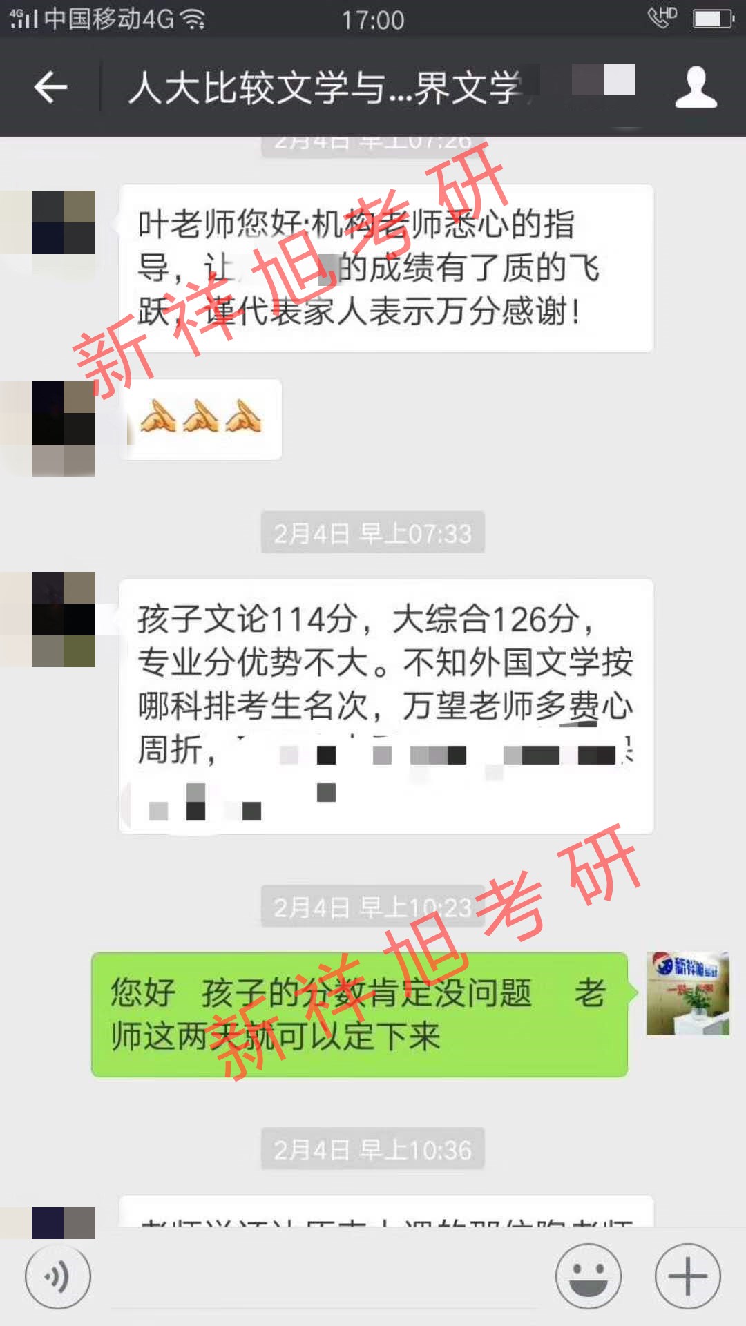 新祥旭2018学员卢同学及其家长与机构工作人员聊天截图: