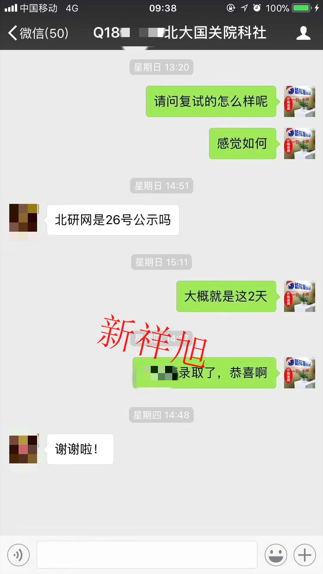 2018年新祥旭北京大学科学与共产运动何学员与教务老师聊天截图: