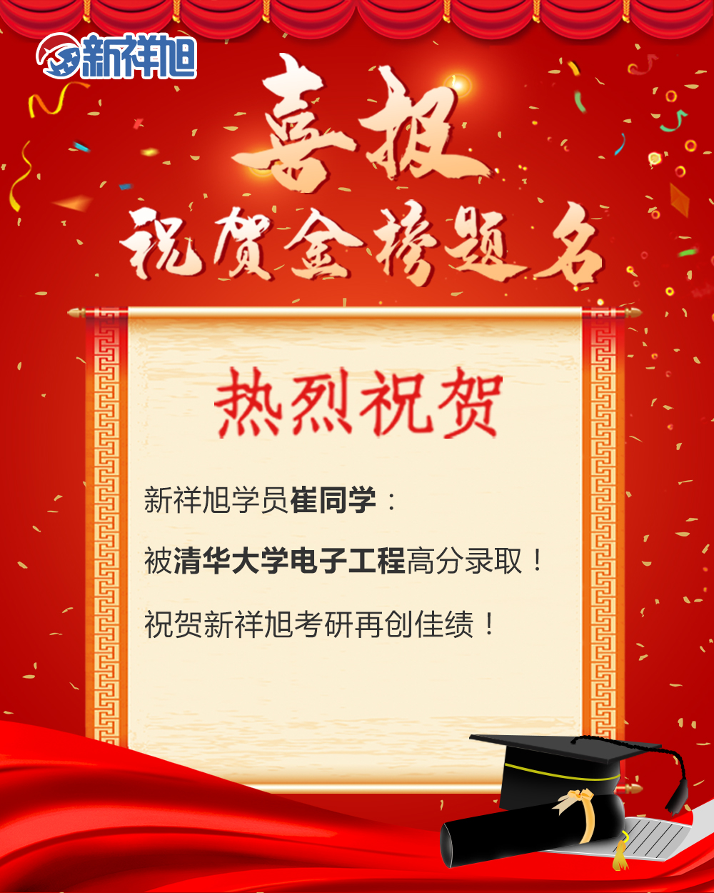 喜报:恭喜新祥旭2019年学员崔同学被清华大学电子工程专业成功录取