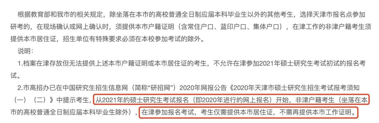 以第一个发布的天津为例:“非津户籍考生(坐落在本市的高校普通全日制应届本科毕业生除外),在津参加报名考试,考生仅需提供本市居住证,不需再提供本市工作证明。”