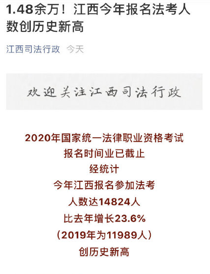 根据重庆发布的消息显示,全市共有14504名考生报名,比去年增加了1900余人,增幅15.34%左右,法考报名人数创历年新高。两天之内报考人数就已经破了2万。在报考人员分布方面,法律类专业的占到55.92%,法院、检察院及其他法律职业占到21.93%,在校大三、大四年级学生占到35.18%。