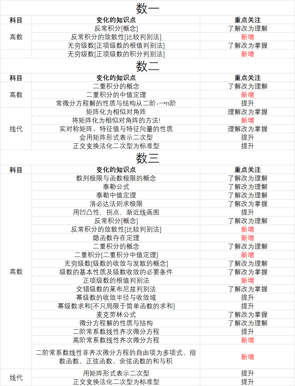 ③数一&数二&数三知识点的变动
