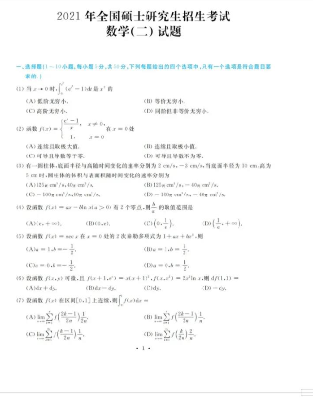 新祥旭考研:2021考研公共课----数学(二)回忆版真题