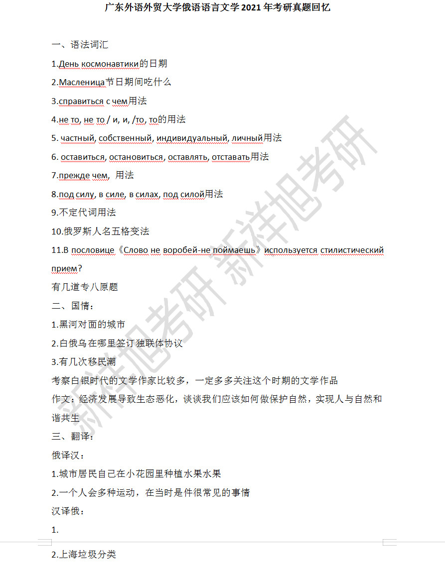 新祥旭考研:广东外语外贸大学俄语语言文学2021年考研真题回忆
