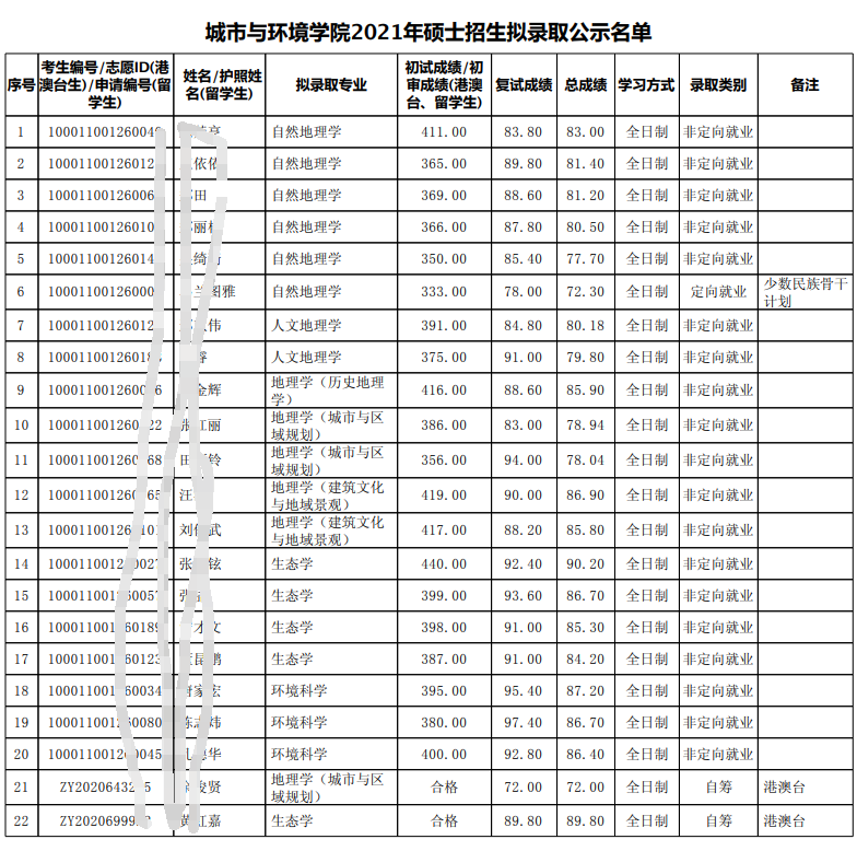 2021年北京大学城市与环境学院硕士招生拟录取名单公示