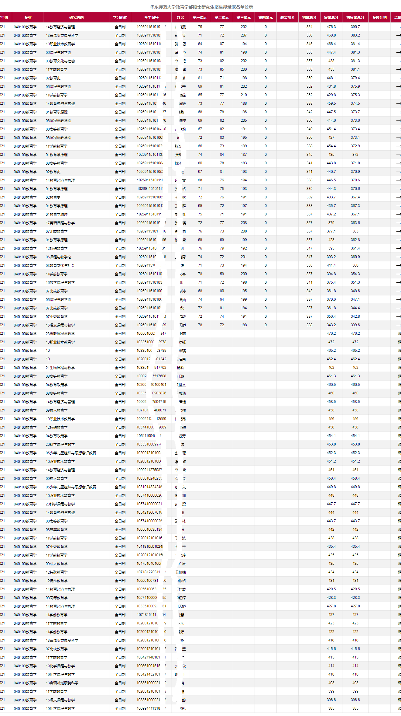 2021年华东师范大学教育学部硕士研究考研拟录取名单公示