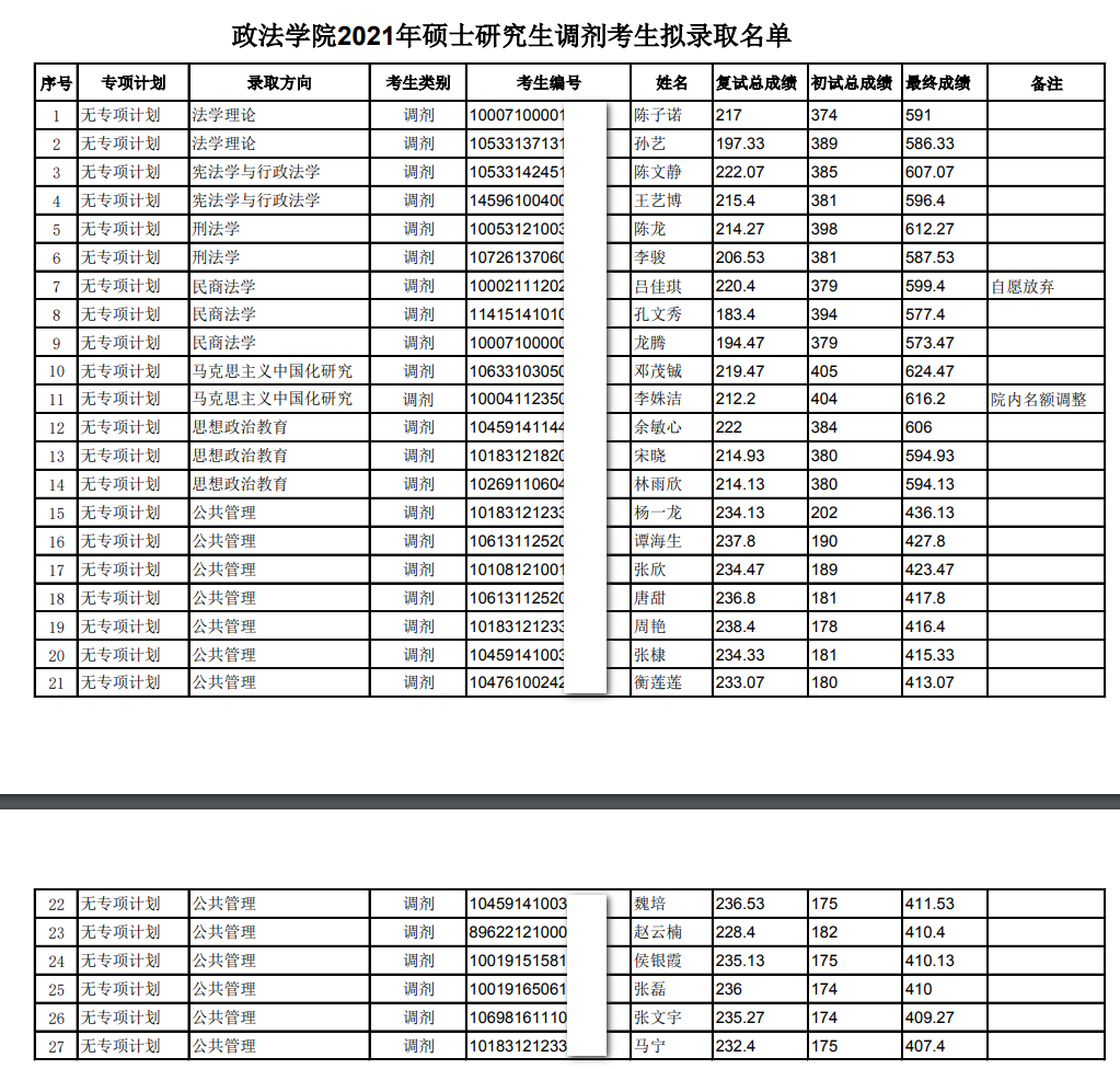 2021年东北师范大学政法学院硕士研究生一志愿及调剂考生拟录取名单