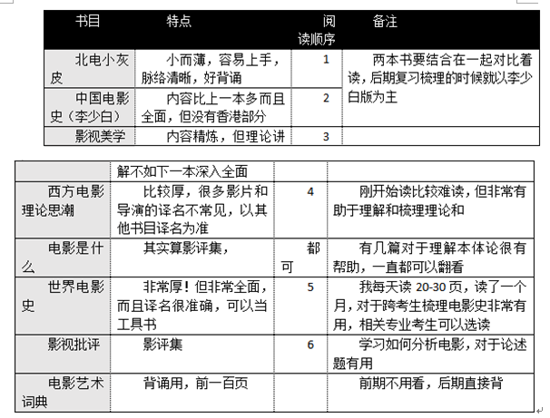 除世界电影史和艺术词典外的书目都要看两遍,3月到6月除了上课我就一直在看书和看片。背书我是从8月左右开始背的,现在看来是有点晚了,可以从7月一开始就背专业课。