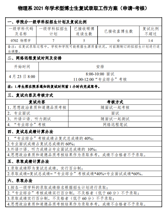 2021年首师大物理系学术型博士生复试录取工作方案(申请-考核)
