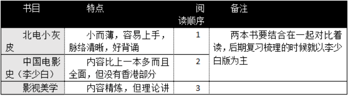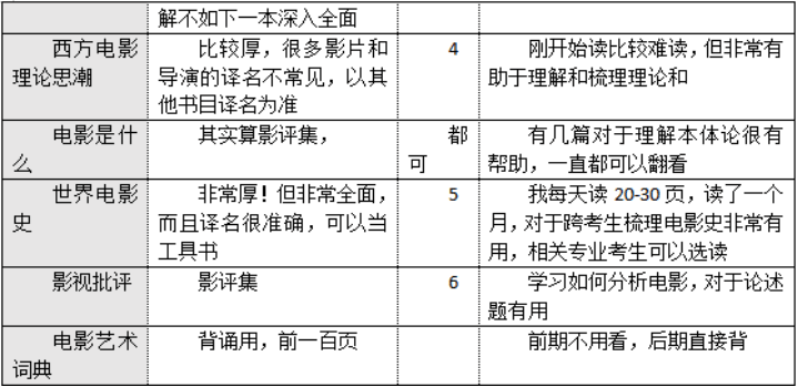 除世界电影史和艺术词典外的书目都要看两遍,3月到6月除了上课我就一直在看书和看电影。背书我是从8月左右开始背的,现在看来是有点晚了,可以从7月一开始就背专业课。