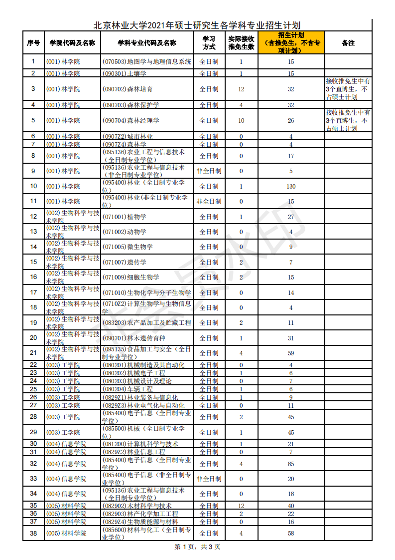 北京林业大学2021年硕士研究生各学科专业招生计划