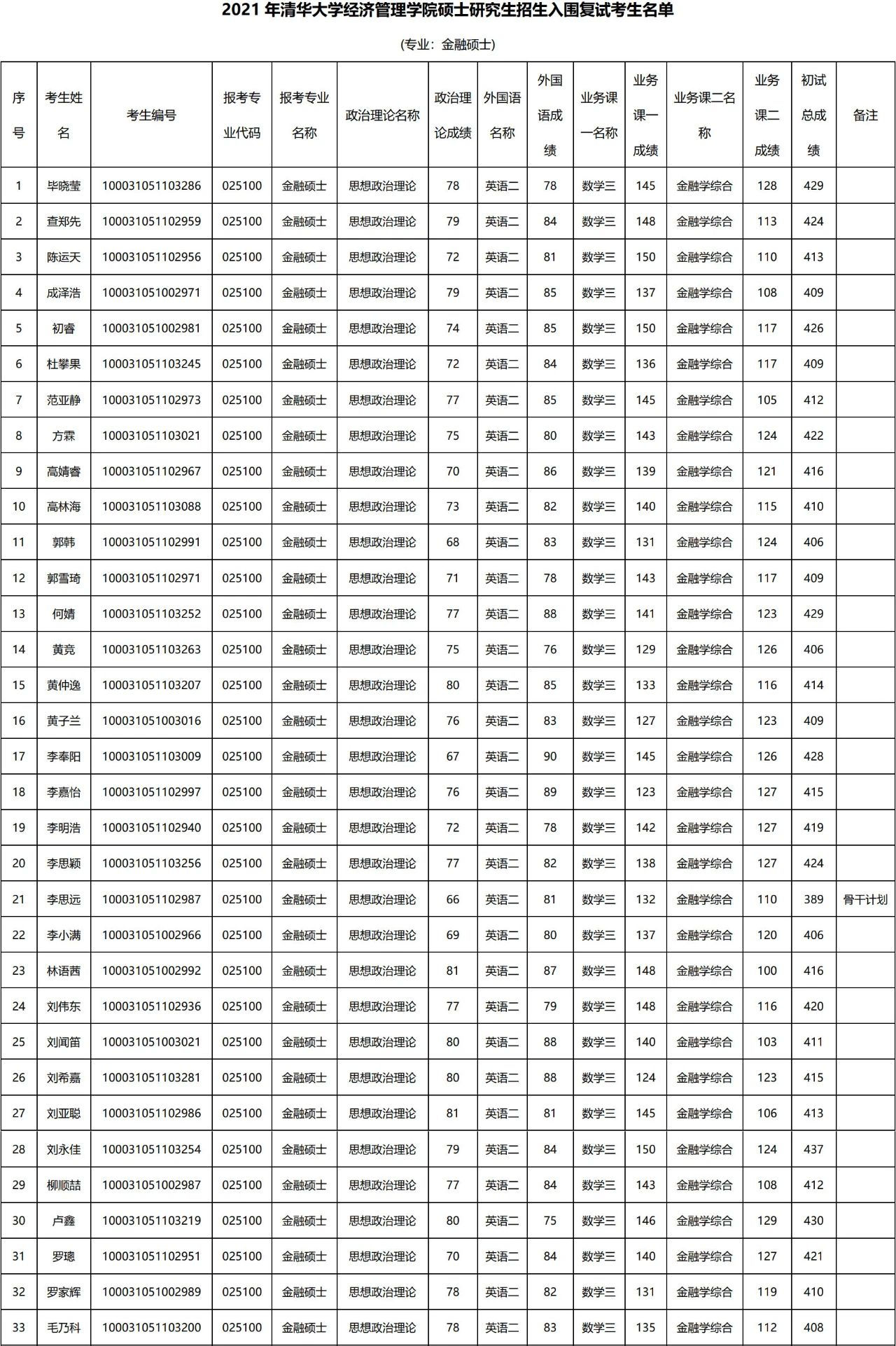 清华大学经济管理学院2021年硕士研究生入围复试名单