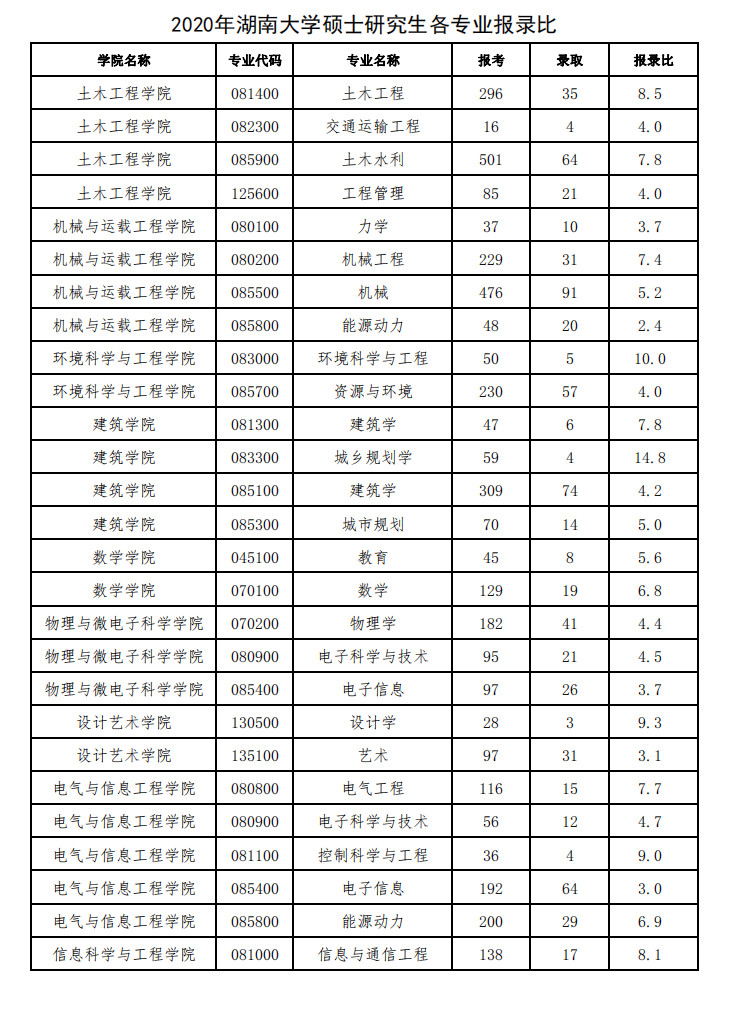 湖南大学考研报录比:2020年湖南大学硕士研究生各专业报录比