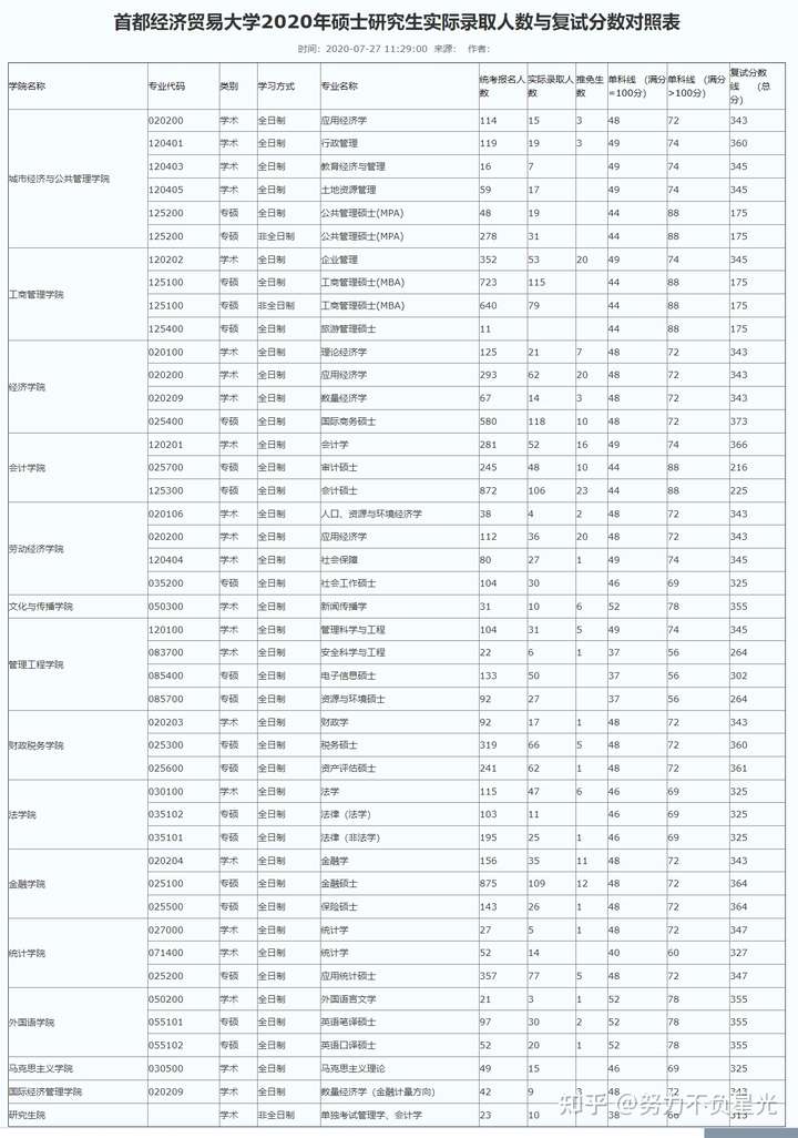②首都经济贸易大学2020年硕士研究生实际录取人数与复试分数对照表