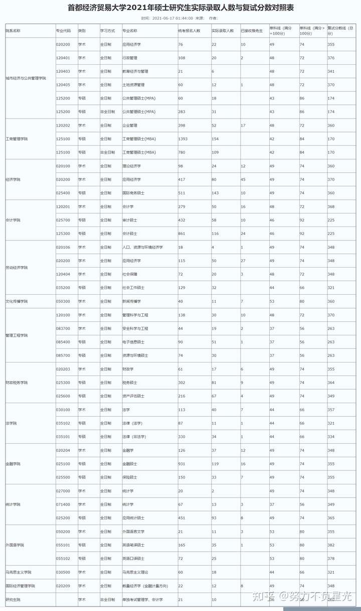 ①首都经济贸易大学2021年硕士研究生实际录取人数与复试分数对照表