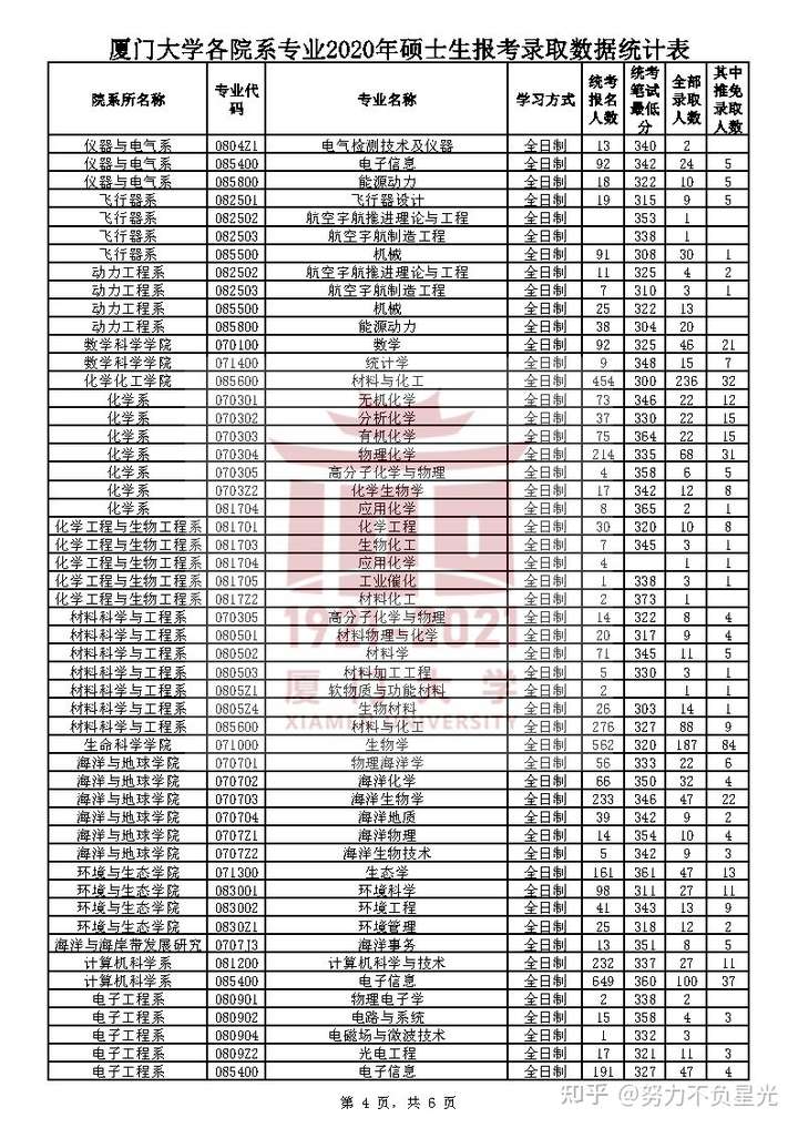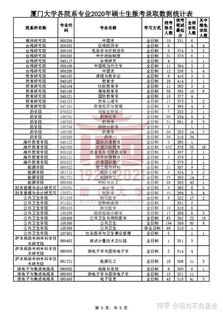 厦门大学各院系专业2020年硕士生报考录取数据统计表