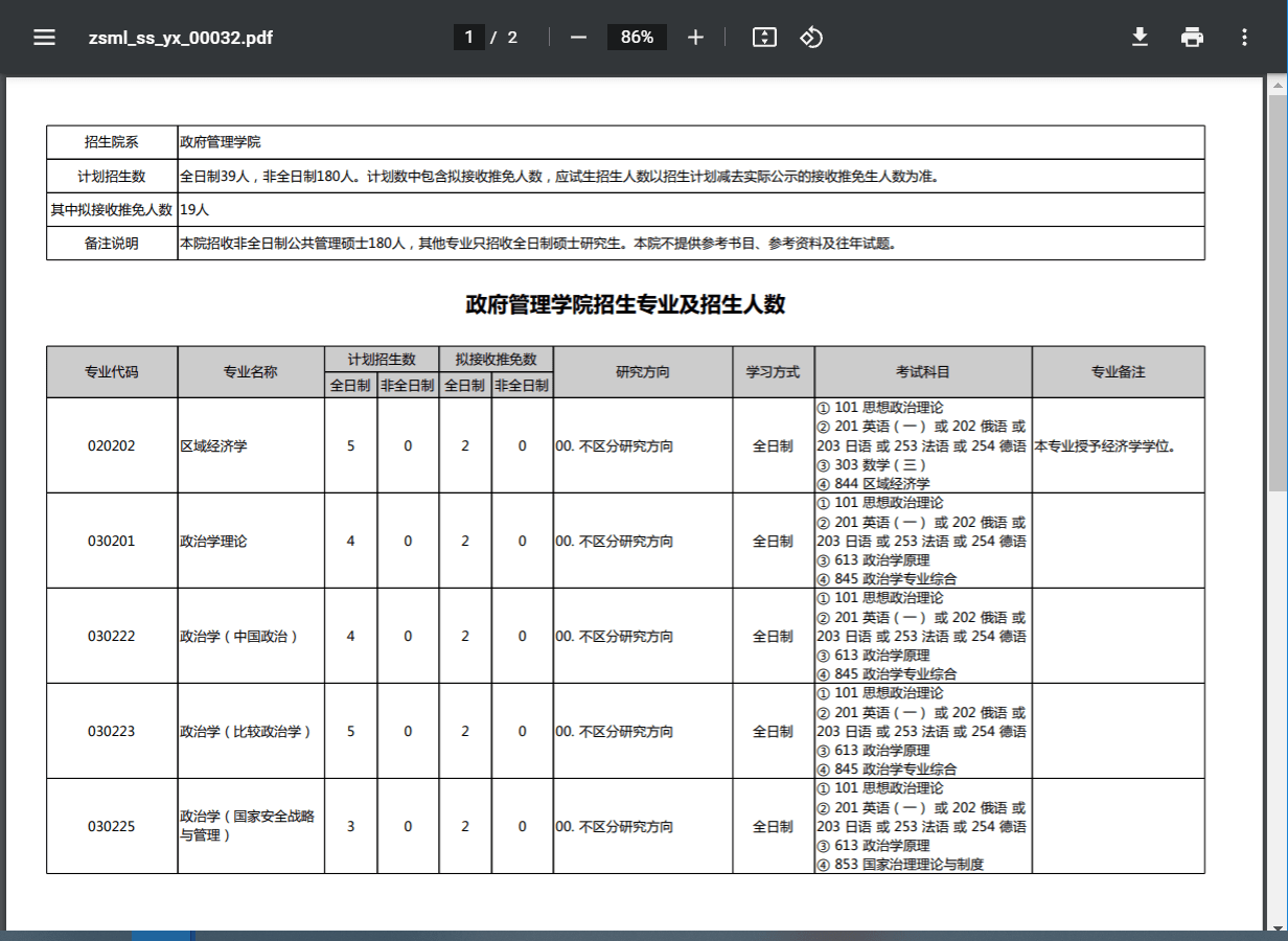 政府管理学院招生专业及招生人数