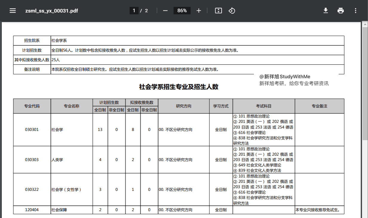 社会学系招生专业及招生人数