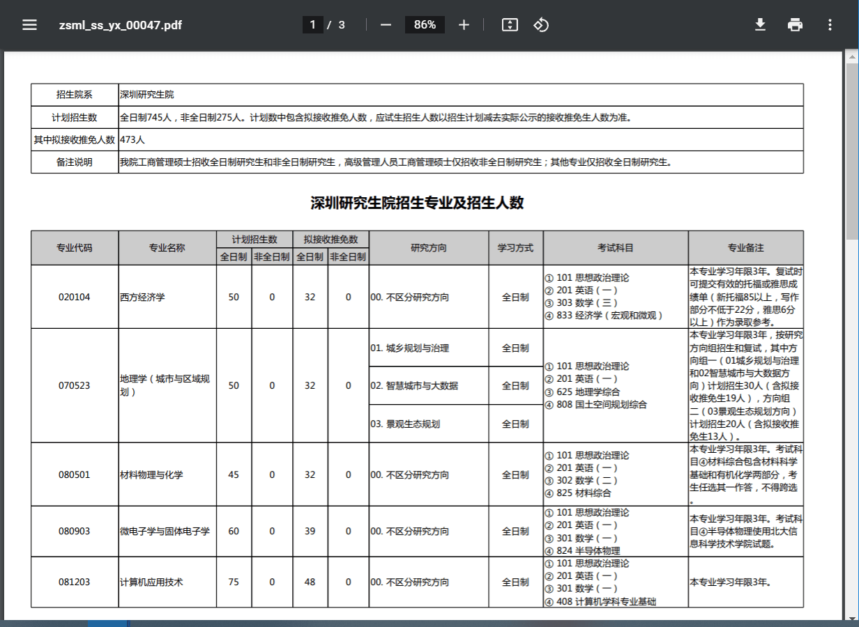 深圳研究生院招生专业及招生人数