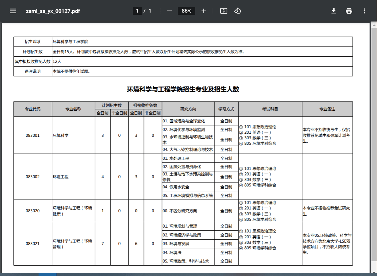 环境科学与工程学院招生专业及招生人数