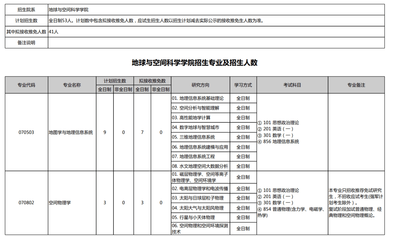 地球与空间科学学院招生专业及招生人数