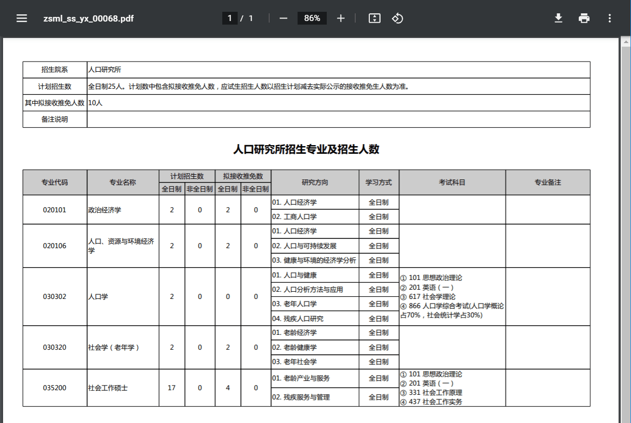人口研究所招生专业及招生人数