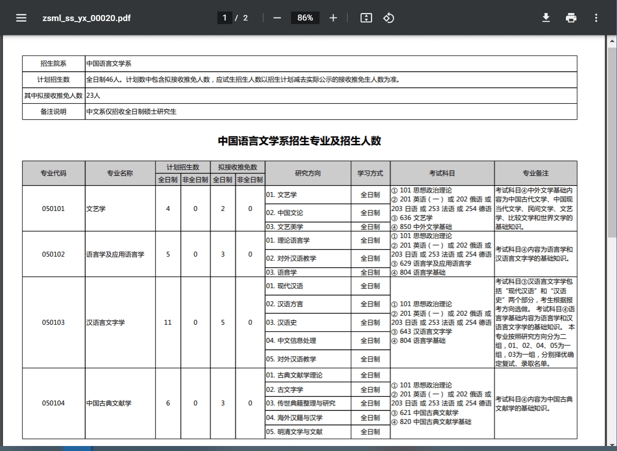 中国语言文学系招生专业及招生人数
