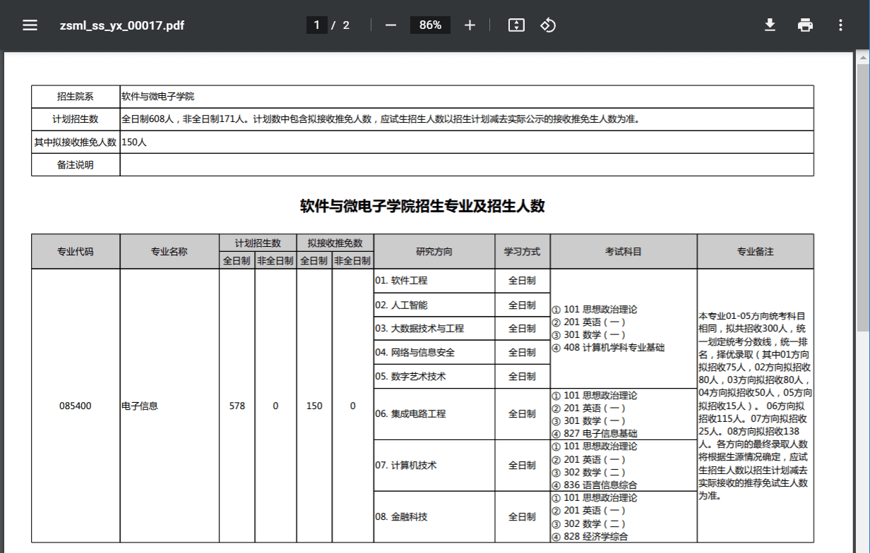 软件与微电子学院招生专业及招生人数