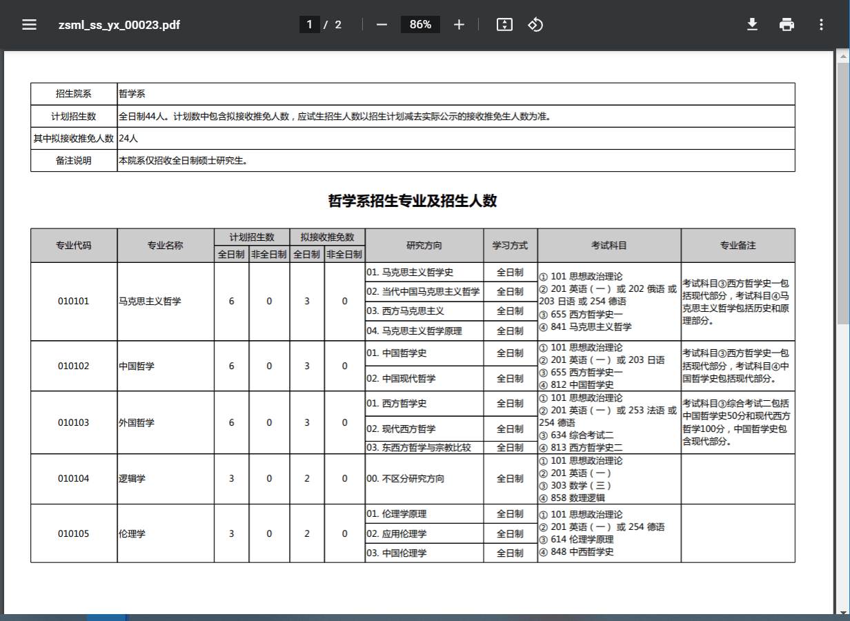 哲学系招生专业及招生人数