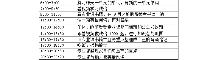 后期背书任务越来越重的时候,大部分一天的三分之二都在背自己整理的专业课重点,具体时间要根据自己的复习情况和任务紧迫性随时调整。