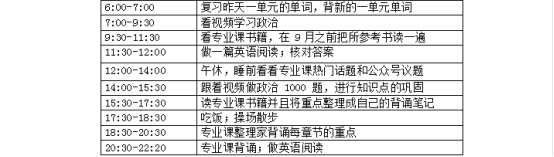 后期背书任务越来越重的时候,大部分一天的三分之二都在背自己整理的专业课重点,具体时间要根据自己的复习情况和任务紧迫性随时调整。