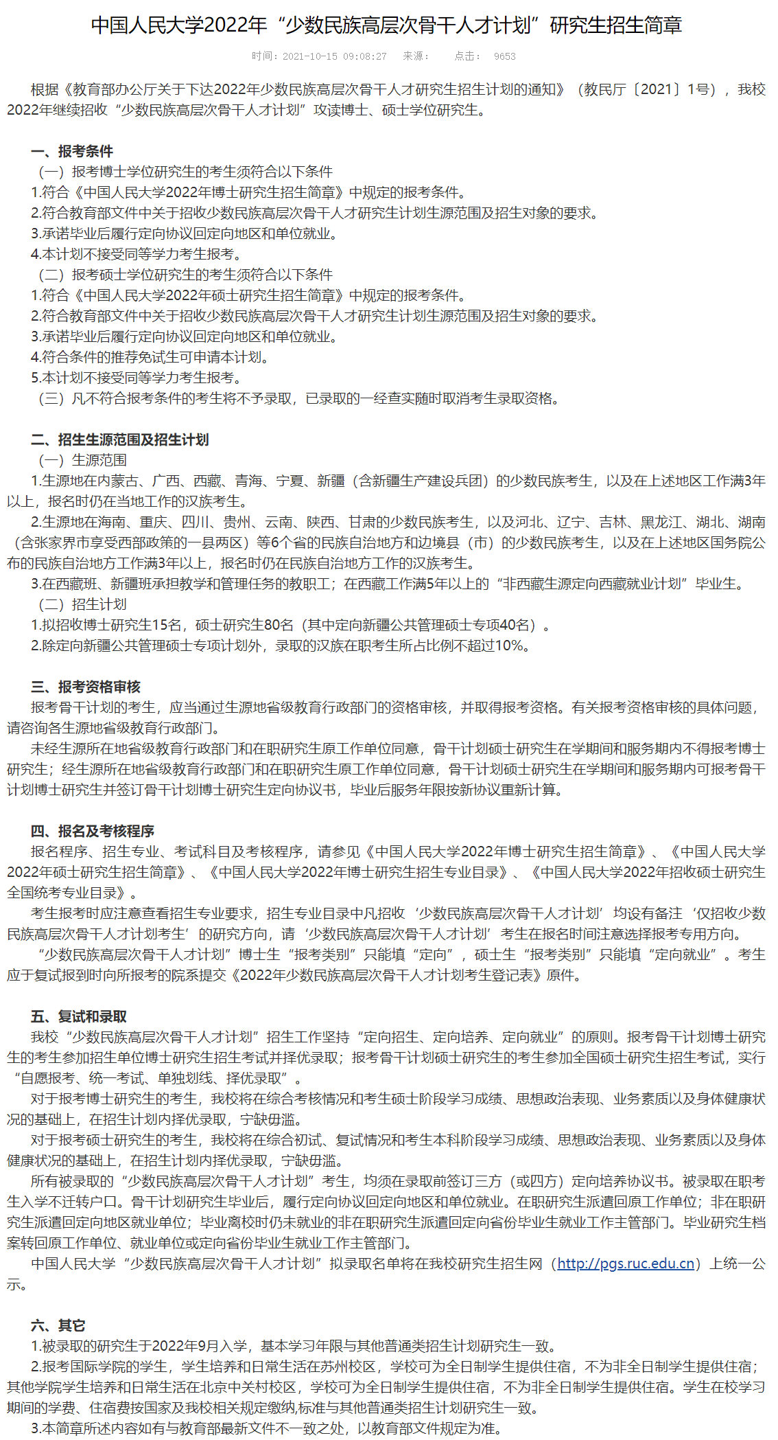 新祥旭导读:本文信息来源于相应大学的研招网官网《中国人民大学2022年“少数民族高层次骨干人才计划”研究生招生简章》,适用于参加21年12月底考研的学生,可供21年及以后考研的学生参考。