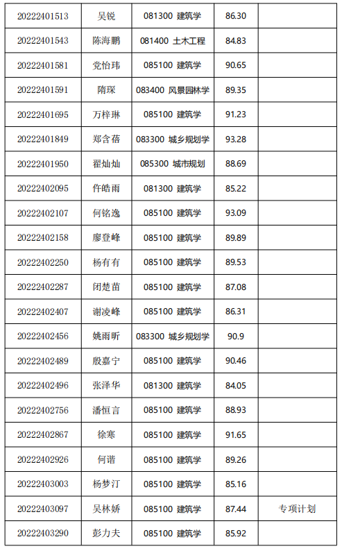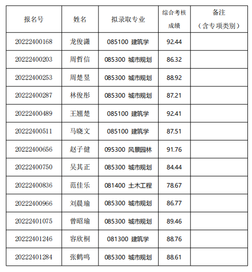 经综合考核和研究生招生工作领导小组讨论,报学校研究生招生工作领导小组批准,清华大学建筑学院2022年接收推荐免试直硕生拟录取名单,现已确定,现予以公示。