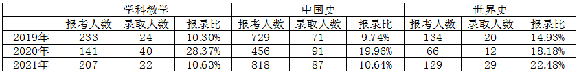 2.中国史和学科教学在2020年的报录比都有一个上升趋势,但是到了2021年又降下去了。这一点需要明白当时的特殊原因:初次统考,大多数学生准备不及而改变学校,加上疫情原因保护第一志愿,所以2020年入选难度降低。之后应该会持续保持10%左右的报录比,这是各位同学需要注意的。