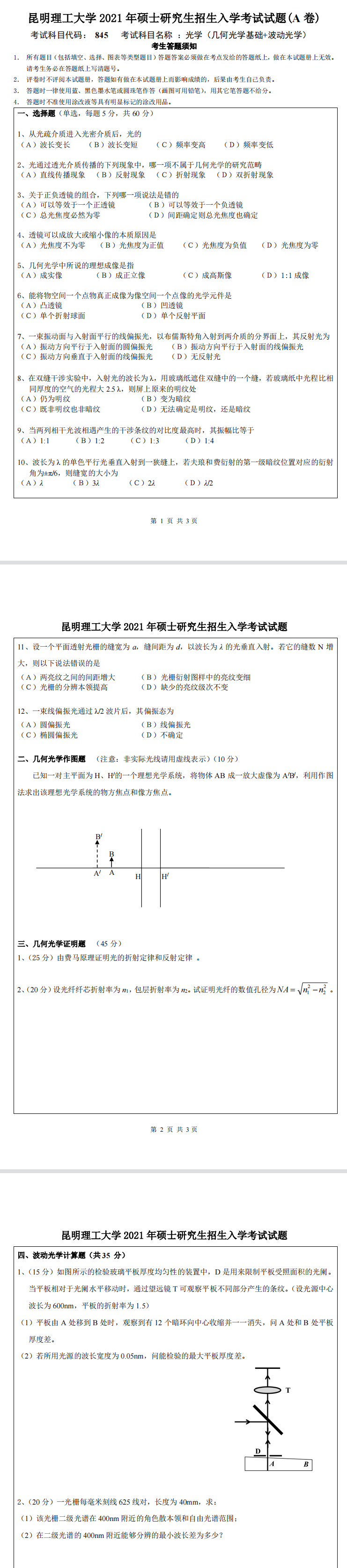 昆明理工大学考研辅导班:2021年昆明理工大学研究生入学考试845光学考研真题