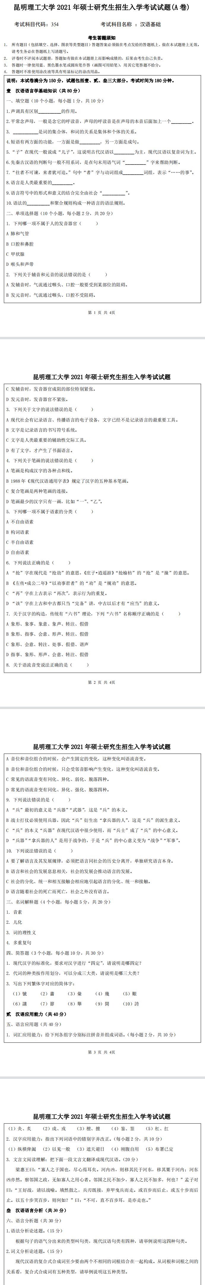 昆明理工大学考研辅导班:昆明理工大学2021年研究生入学考试354汉语基础考研真题