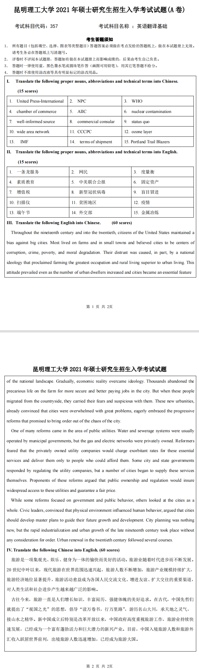 昆明理工大学考研辅导班:昆明理工大学2021年研究生入学考试357英语翻译基础考研真题