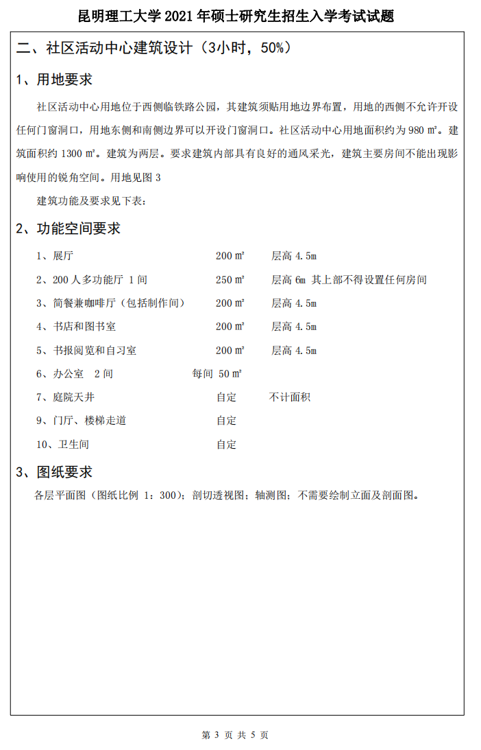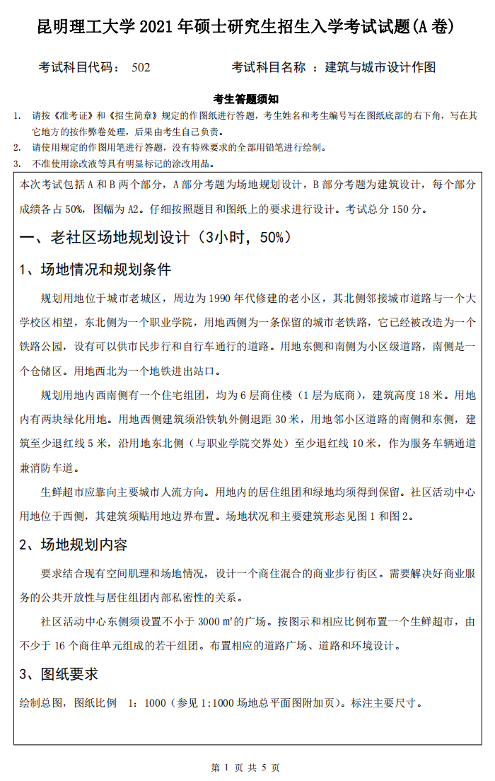 昆明理工大学考研辅导班:昆明理工大学2021年研究生入学考试502建筑与城市设计做图考研真题