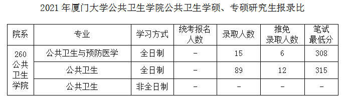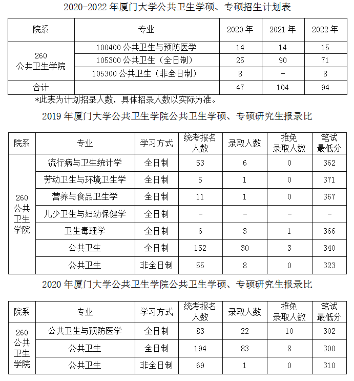 下表是2020年-2022年厦门大学公共卫生学院招生计划人数及2019年-2021年厦门大学公共卫生学院研究生报录情况介绍: