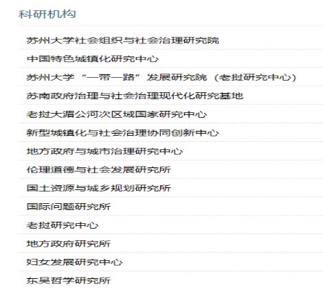 苏州大学政治与公共管理学院拥有哲学、政治学、公共管理学、管理科学与工程4个一级硕士学位授予点和16个二级硕士点以及公共管理MPA专业硕士学位点;哲学、政治学2个一级学科博士授权点,涵盖14个二级学科博士点与博士后流动站,其中政治学为江苏省高校优势学科,哲学为江苏省重点学科,行政管理为江苏省特色专业。