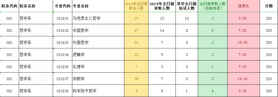 中国哲学专业是报考人数最多的热门专业,招生人数为14人,但推免生占据了8个名额,剩余6个统招名额,报录比为7.83。