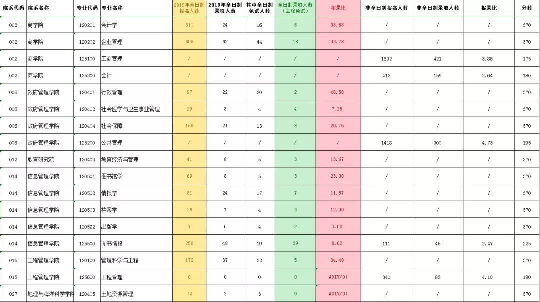 同时,会计学与企业管理这两个专业,报名人数也非常多,报录比高达38.88和33.78,复试线为370,仍是两个难度很高的专业。
