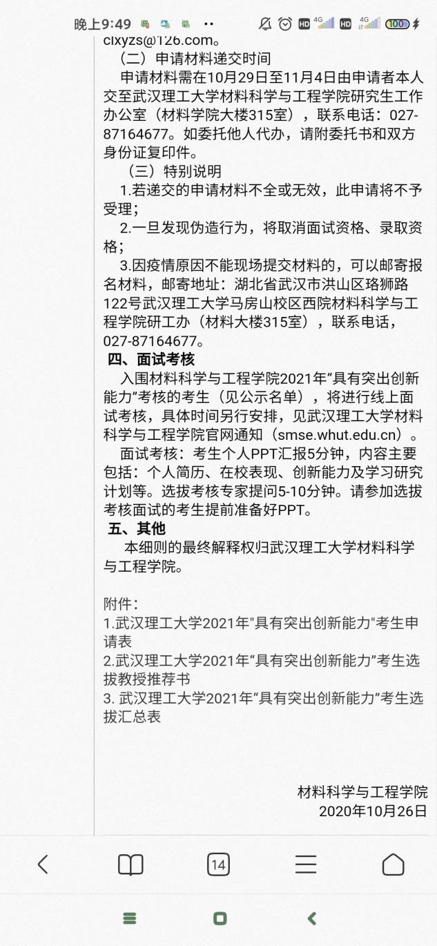 这个是先要提交材料然后再去面试讲PPT介绍自己的本科经历,材料里面有提到推荐信(建议不管考什么渠道申请都要有推荐信),必须是三个教授的推荐信(副教授不行)。这个的面试不会刷人(PPT出现问题的我都过了!)拿到这个资格的基本只要初试过了,就没问题,复试及格就行(武理复试只要不要辱骂老师,没有不过的哈哈哈),所以这个资格就是复试通行证。大家十月份就再官网关注一下通知,然后准备好材料,这个一般是十一月份面试。总而言之,创新能力=复试通行证。
