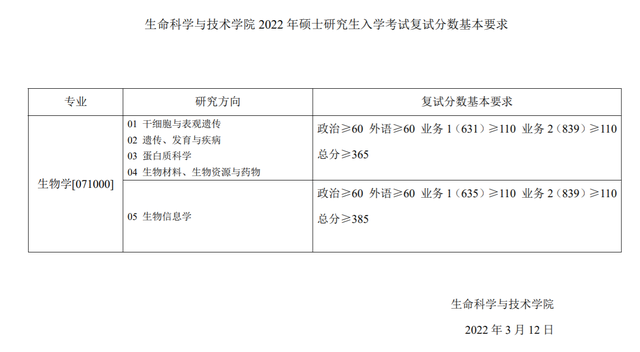 生命科学与技术学院 2022 年硕士研究生入学考试复试分数基本要求