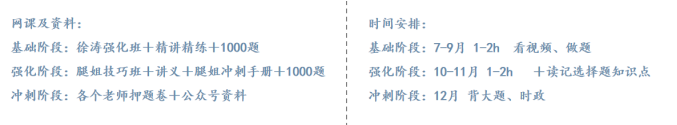 (三)政治,这里同样推荐一下我当时跟的老师和网课。政治大家在前期不用担心。暑假以后就看每天看视频课做选择题,在强化阶段读记一些细碎的选择题知识点,等到12月各个老师的押题卷以及肖八肖四出了开始背诵时政内容及大题。大家也可去网上的考验博主和公众号那里看看一些总结的政治知识点等内容,总之按着步骤一步步来就好。