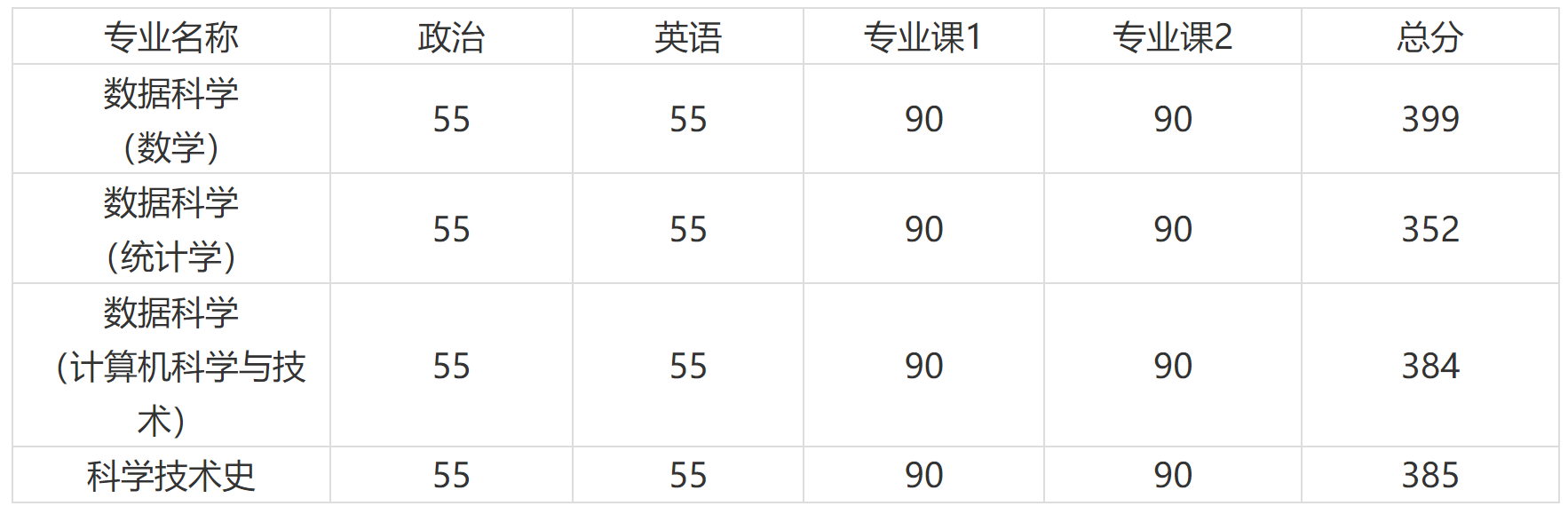 复试成绩采用百分制(或换算成百分制)记分,60分为合格。复试成绩不及格者不予录取。复试成绩及格者,依考生的总成绩排名以招生名额为限依次录取。总成绩包括两部分,即初试成绩和复试成绩。其中数据科学类专业:初试成绩占总成绩60%,复试成绩占40%;科学技术史专业:初试成绩占总成绩的50%,复试成绩占总成绩的50%。