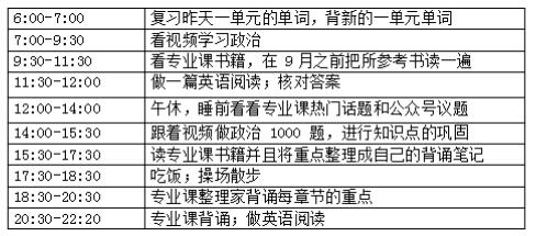 后期背书任务越来越重的时候,大部分一天的三分之二都在背自己整理的专业课重点,具体时间要根据自己的复习情况和任务紧迫性随时调整。