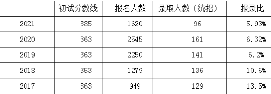 从报录比数据变化可以看到中南财的竞争越来越大,2021年分数线甚至高达385(与专业课给分较高有关),目前来看,2022年的初试分数线有所降低。2021年统招出现大幅缩招的情况,当时官方文件招生数41,但最终因为保研未达计划数,将剩余的名额给了统招。