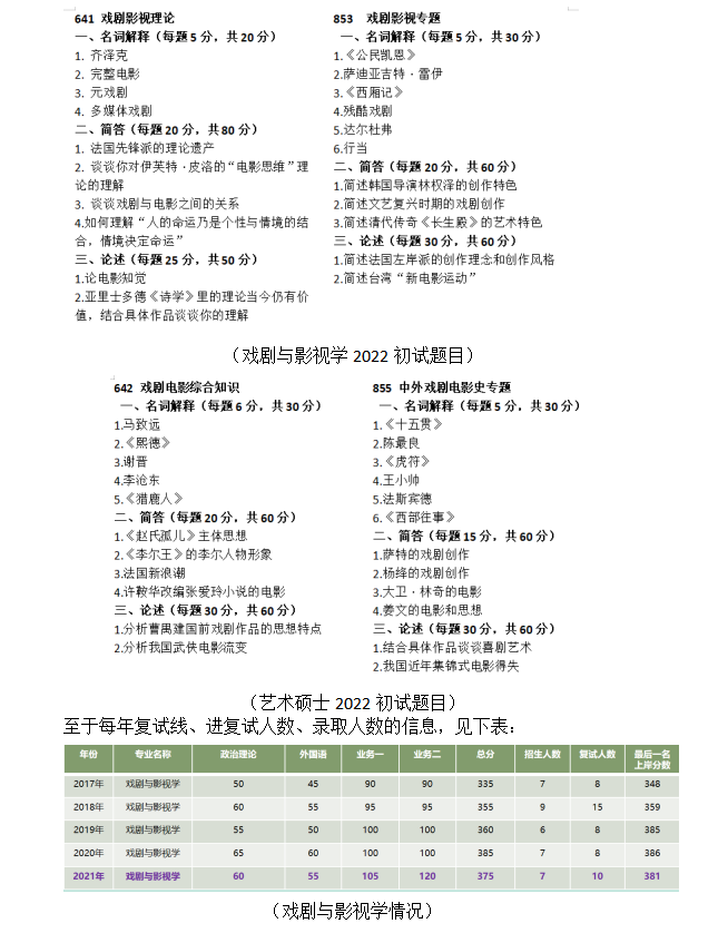 而考试科目可见下表,专业课会涉及中外电影戏剧戏曲史、视听语言和戏剧语言的内容,但是需要注意的是,学硕会有一门专业课专门靠中外电影、戏剧、戏曲理论,而专硕则不会考。